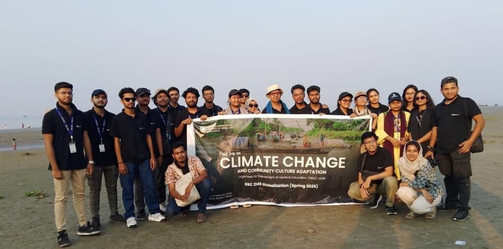 ULAB’s Globalization Spring 2025 course students visit the lifestyle of the Manta community Publish Date: April 7, 2025 A field trip was organized on February 20, 2025, as part of the GED Globalization (Spring 2025) course to visit the Manta community of Bhola. The main objective of the field trip was to gain practical experience about the livelihood, social and economic conditions and educational opportunities of the marginal fishing Manta community in the context of #climate #change. It was conducted under the supervision of ULAB professors and researchers and was completed in collaboration with the local organization “Jago Nari”. In this field trip, 33 students went on a field trip led by the principal researcher Dr. Ahmed Abid and the research coordinator Dr. Asaduzzaman Mohammad. In addition, two ULAB mentors, Zubayd Hossain and Rajanul Raj, participated for the students. Our 6-member team was led by Field Trip Team Leader Sabrina Mostafa Shuchi and Mahmudul Hasan Sumon. Also present were Ahmed Hamim, Noor Subha Biva, Afrina Chowdhury Sohana and Momtaz Fahmida Rifa. Observations show that most of the people of this community live on boats and their livelihood is mainly fishing. They live in a very hostile environment, where basic amenities are lacking. Education and healthcare have become major challenges for this community. There are not enough schools for the children of the Manta community and the literacy rate is also very low. In addition, lack of healthcare, malnutrition and insufficiency of safe water have become major obstacles in their daily lives. The situation of women was also specially observed. Although women of the Manta community play an important role in the family and livelihood, they face various social and economic challenges. Their educational opportunities are limited and they face various obstacles in accessing healthcare. During the visit, Jago-Nari, a service organization, organized a community consultation, where the main discussion was on increasing educational opportunities and opening a school. In this discussion, members of the Manta community expressed their opinions and highlighted the need to increase educational opportunities. The local organization “Jago Nari” is already working on this issue and plans to take more development initiatives in the future. Through the field trip, the students got the opportunity to gain practical experience and gain knowledge about the real picture of globalization and social inequality. It was possible to directly observe the issues of lack of educational opportunities, limited healthcare, and discrimination against women. The students observed and learned that the Jale community is generating electricity with the help of solar panels and using it. Women are quite enthusiastic about using sanitary napkins for their needs. They also have some idea about birth control methods. Since the people of the Manta community do not have any land or house, they live on boats. Even their cooking is done on boats. While the general public engages in fishing as well as agriculture, the Manta community is solely dependent on fishing. The life of the Manta people is very risky, as they stay in boats even during natural disasters. We spoke to them and learned that they do not take shelter in any kind of shelter during this time. A woman named Lucky, who is over 20 years old, said, “We do not know anything about this, we do not even know where the shelter is.” Many times, when their boats break in storms and their lives are at risk, they take temporary shelter in nearby boats. Seeing the life of the Manta community has increased the sense of social responsibility among the students. The field trip was very successful, and the entire program was conducted without any accidents. It was an important learning and research experience for all of us. We need to think about how to work in the future for the development of the Manta community and it is important to take long-term steps in this regard. The report is a sample of that – so that we can share this experience with friends and Ulabians. This experience has made us more sensitive to the marginalized groups of our society and inspired us to contribute to social development. Report Authors: Sabrina Mostofa Suchi Mahmudul Hasan Sumon Noore Subah Biva Afrina Chowdhury Sohana Momtaj Fahmida Rifa MD Kawsar Ahmed Hamim GED Globalization (Spring 2025)